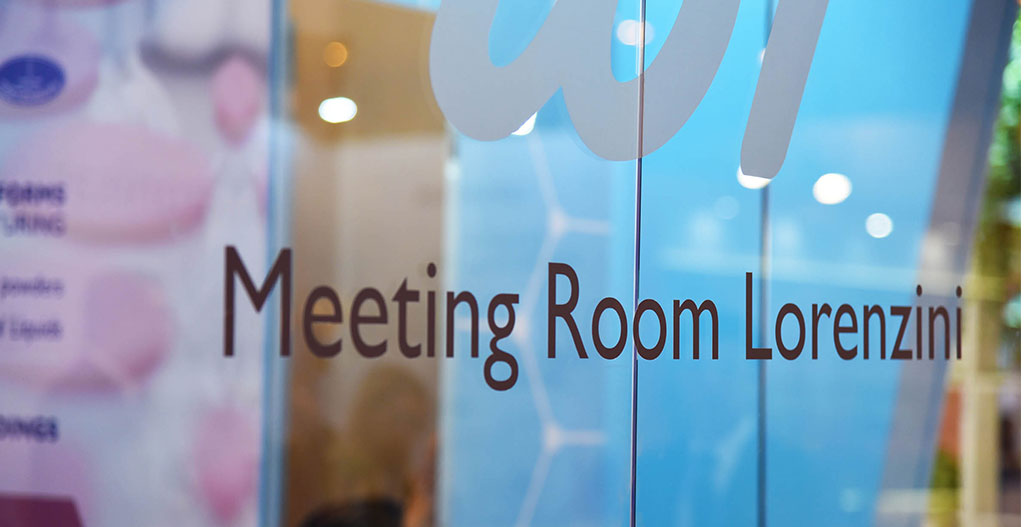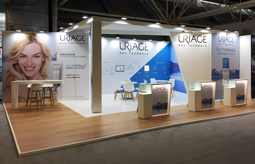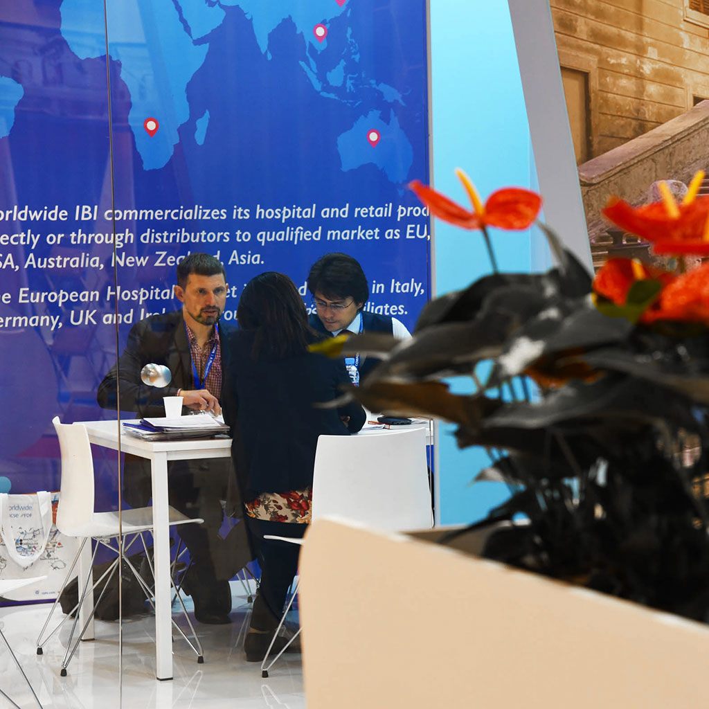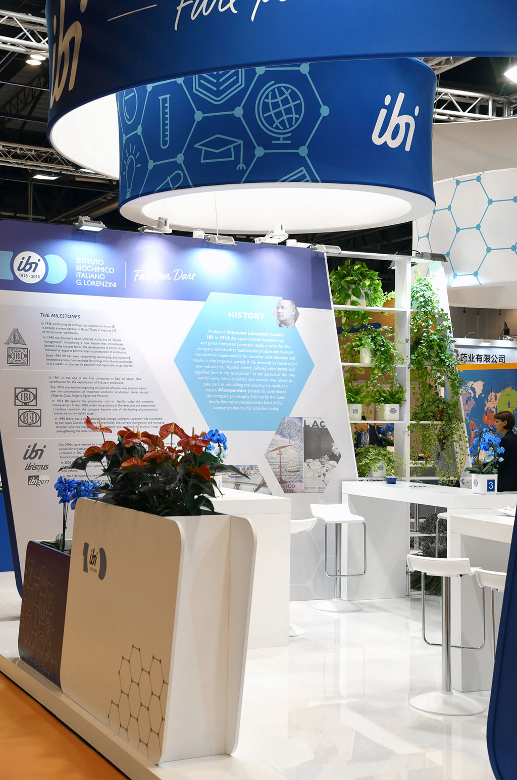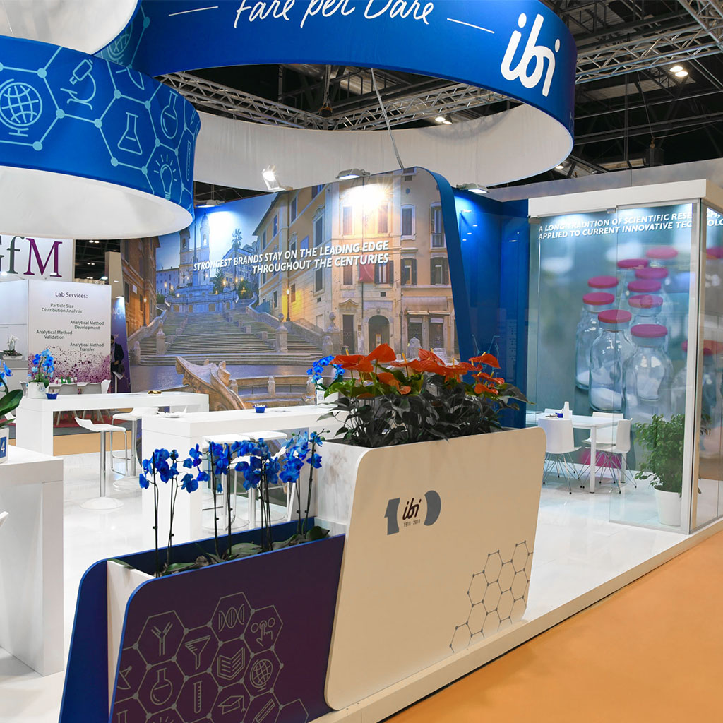 Per IBI abbiamo studiato degli appendimenti circolari che rendono visibile lo stand anche a distanza.